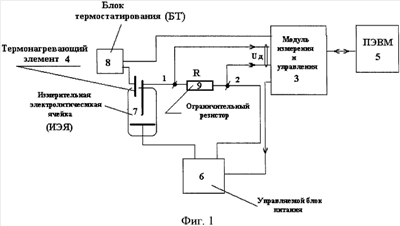 По команде оператора ПЭВМ 5 включает управляемый блок питания 6, который начинает выдавать напряжение питания величиной 2 вольта на измерительную электролитическую ячейку (ИЭЯ) 7. Затем ПЭВМ 5 переводит блок термостатирования (БТ) 8 в режим автоматической поддержки температуры исследуемого раствора гомогената ткани, находящегося в ИЭЯ 7. После чего запускается процесс сбора и обработки информации, поступающей на ПЭВМ 5 с модуля измерения и управления 3. Время эксперимента задается на ПЭВМ 5 в зависимости от цели эксперимента.