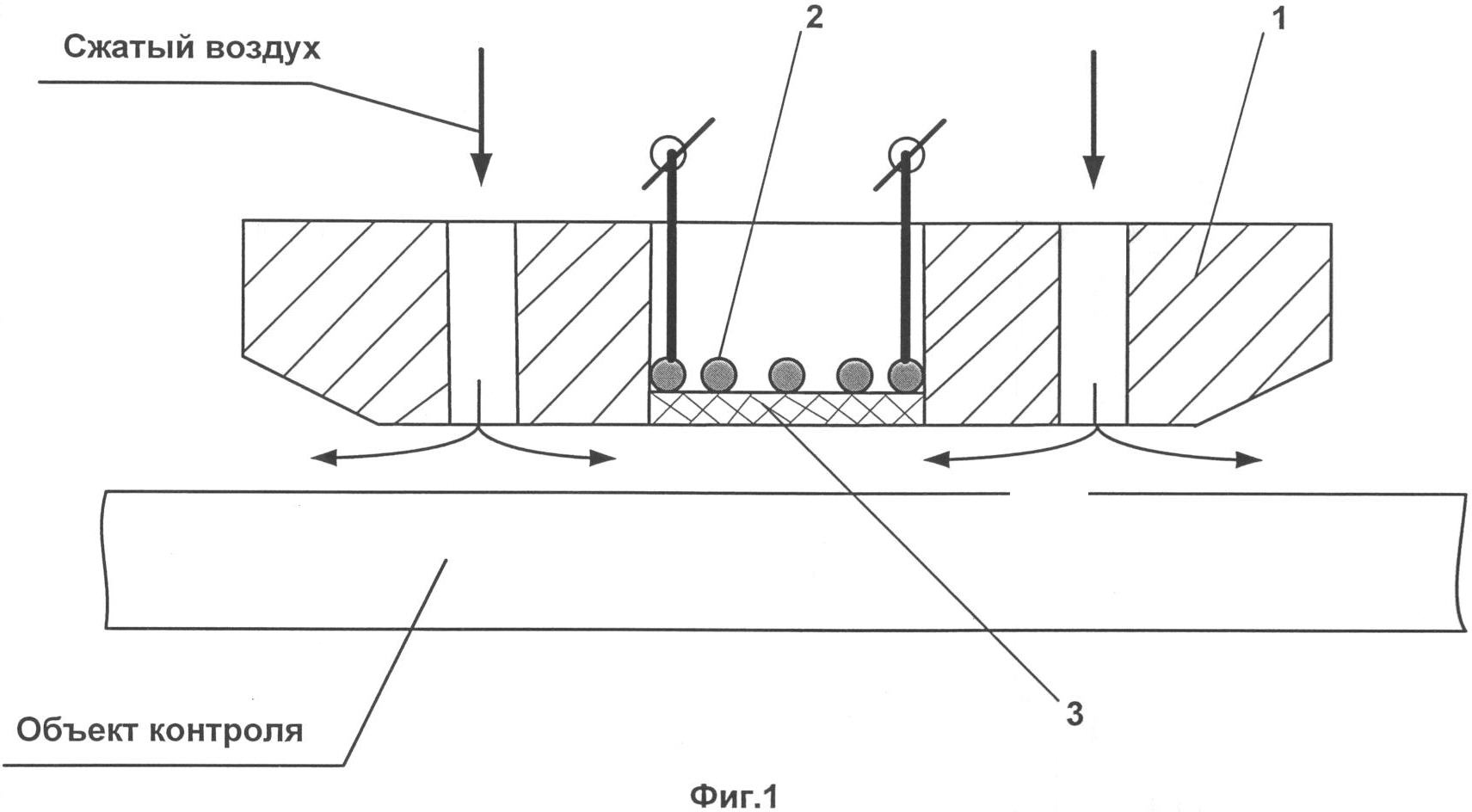 1. Электромагнитно-акустический преобразователь на «воздушной подушке», включающий, в частности, корпус-подложку с отверстиями для выхода воздуха, питающего воздушную подушку, один или более индуктор и протектор, выполненный в виде керамической пластины, отличающийся тем, что протектор, размещенный между подложкой и объектом ультразвукового контроля, содержит отверстия для выхода сжатого воздуха, питающего «воздушную подушку», а размеры протектора существенно превышают размеры индуктора, или группы индукторов, входящих в состав электромагнитно-акустического преобразователя, причем площадь протектора соизмерима с площадью рабочей поверхности подложки и согласована с нею и объектом контроля по форме.