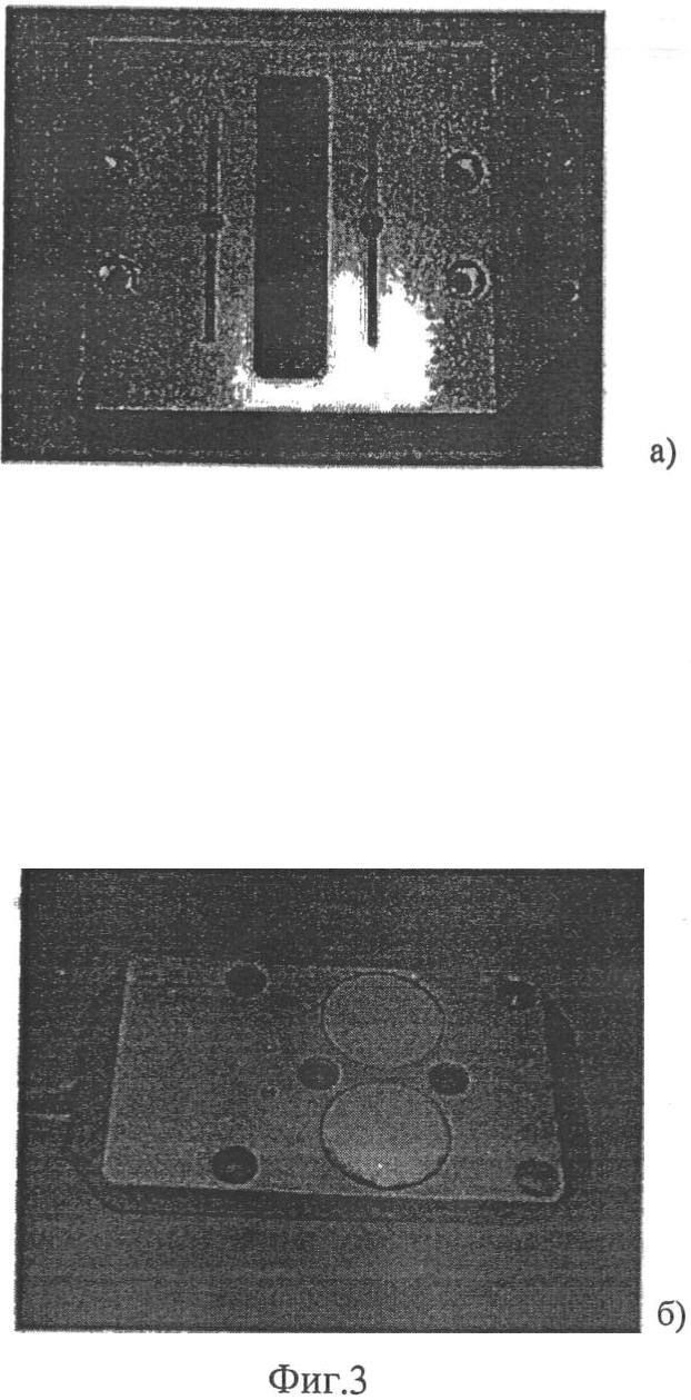 На фиг.3. в качестве примера приведены фотографии ЭМАП для контроля листового проката, использующего пары «индуктор-протектор» и «группа индукторов-протектор», изображенные на фиг.2. Согласованная по форме с объектом контроля подложка содержит отверстия для выхода сжатого воздуха и ответственна за формирование «воздушной подушки».