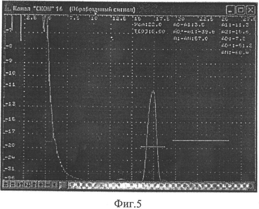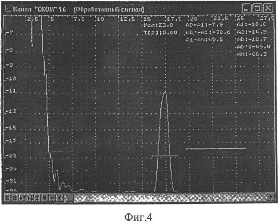Пример А-развертки, на которой видны импульсы, обусловленные проявлением акустической помехи, приведен на фиг.4. Помеха проявляется в районе зоны, обозначенной красным стробом