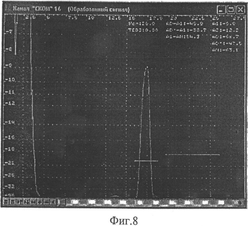 На фиг.8. изображена А-развертка сигнала, полученного с помощью ЭМАП, подложка которого совмещена с протектором и целиком выполнена из керамики. Длительность зондирующего импульса на А-развертке практически не отличается от случая, приведенного на фиг.7.