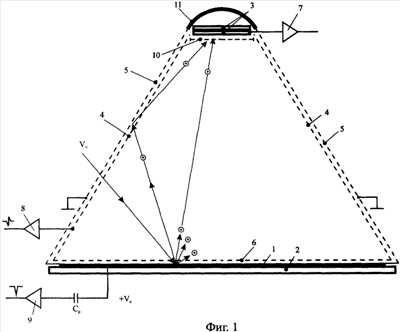 1. Детектор микрометеороидных и техногенных частиц, содержащий мишень в виде пленочного конденсатора, нанесенного на металлическую пластину, приемник ионов, источник постоянного напряжения, отличающийся тем, что приемник ионов установлен на фиксированном расстоянии от мишени, симметрично ее осевой, боковые поверхности детектора состоят из двух расположенных параллельно друг другу сеток, симметрично расположенных относительно оси детектора под углом к мишени, внешние сетки заземлены, а внутренние сетки находятся под плюсовым потенциалом, в непосредственной близости от приемника ионов установлена сетка, находящаяся под минусовым потенциалом, причем внутренние сетки, выходы приемника ионов и мишени соединены с соответствующими усилителями.