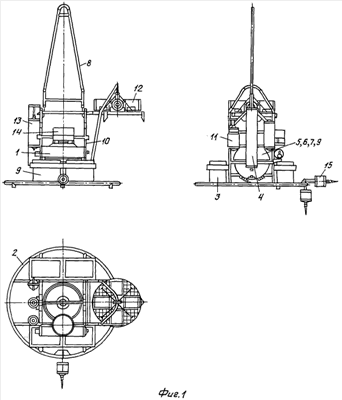 Фиг.1. Подводная обсерватория. Подводная обсерватория состоит из спектроанализатора 1, фермы 2, блока питания 3 для автономной работы, блока контроля 4 радиоактивного загрязнения, прочного корпуса 5, модема кабельной линии связи 6, блока регистрации и управления 7, силовой дуги 8, аппаратуры гидроакустического управления 9, фермы 10, гидрофизического модуля 11, донного сейсмометра 12, блока управления 13 датчиком магнитного поля, катушки прецессии 14, коммутационной коробки 15.