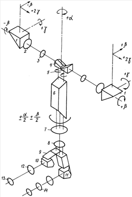 При синхронном повороте в одном направлении головных отражателей 1 вокруг осей, перпендикулярных к горизонтальным оптическим осям головных телескопических систем 2-3, лежащих в отражающих гранях головных отражателей 1, на угол + оптические оси визирования за целью поворачиваются в том же направлении на удвоенный угол поворота головных отражателей + 2 (см. [1], стр.19). Конструктивно головные телескопические системы 2-3 могут быть установлены перед головными прямоугольными отражателями 1 соответствующих им оптических каналов головной части прибора с синхронным поворотом их с головными отражателями 1 в том же направлении с удвоенной угловой скоростью поворота головных отражателей. Для визуальных наблюдений, обнаружения, разведки и слежения за целью по трем взаимно-перпендикулярным прямолинейным направлениям в любой точке полусферы обзора, топографических и астронавигационных измерений достаточно обеспечить углы поворота головных отражателей на углы =±180°, =±90°, =±30°.