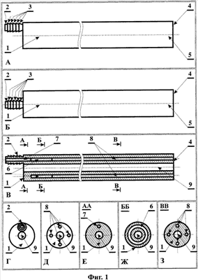 На фиг.1 представлен вид трубки зонда сбоку, сверху, в продольном сечении, сзади, спереди, в сечениях А-А, Б-Б и В-В, где