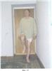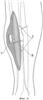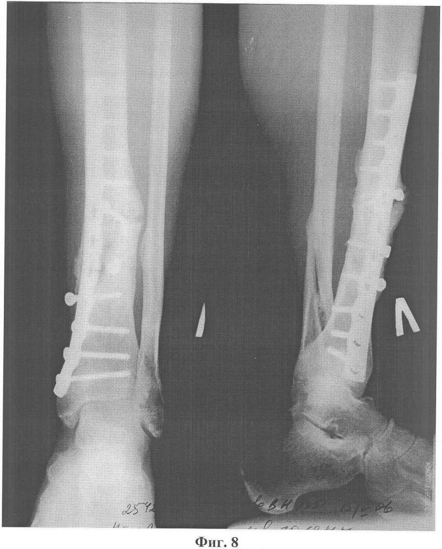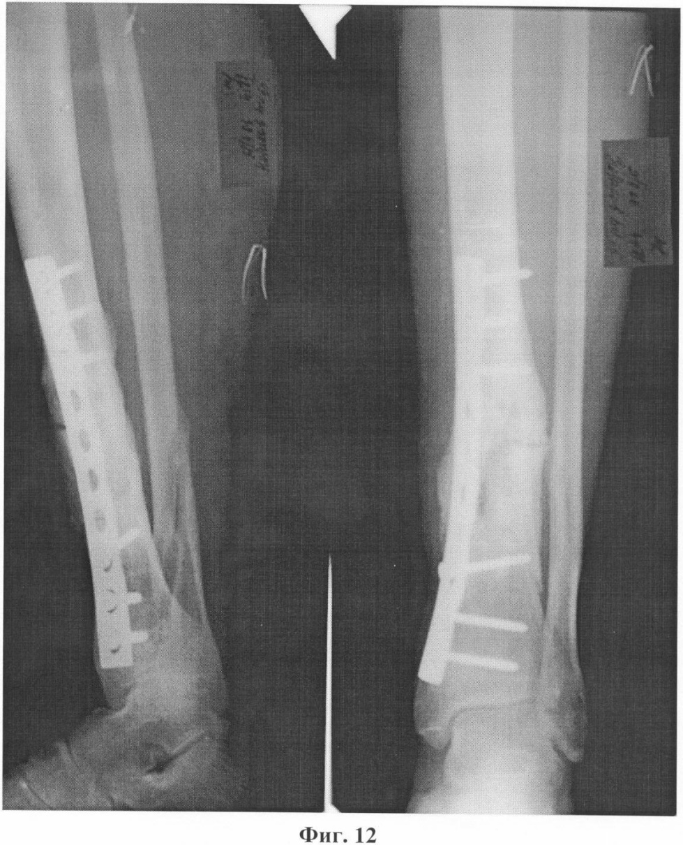 Больной Н., 55 лет, 23 июня 2005 года в результате бытовой травмы получил закрытый оскольчатый перелом обеих костей левой голени. Доставлен в городскую клиническую больницу г.Москвы, где был произведен остеосинтез большеберцовой кости левой голени пластиной АО с ограниченным контактом. Послеоперационный период протекал без осложнений. Проведено восстановительное лечение, включающее ходьбу с костылями с дозированной, постепенно увеличивающейся нагрузкой на оперированную конечность. Через 3 месяца после операции начал ходить с палочкой с полной нагрузкой на левую стопу. Однако при ходьбе отмечал умеренные боли в области перелома. Динамический рентгеноконтроль демонстрировал замедленную консолидацию перелома большеберцовой кости на фоне сросшегося перелома малоберцовой кости. В мае 2006 года боли в голени при ходьбе усилились. При контрольной рентгенографии обнаружен ложный сустав большеберцовой кости с переломом накостной металлоконструкции и миграцией винтов (фиг.8). 6 июня 2006 года под общим обезболиванием сломанная пластина была удалена с выполнением операции на ложном суставе по разработанному способу (фиг.9). После снятия швов и ликвидации отека произведена иммобилизация конечности укороченной циркулярной повязкой Scotchcast (до коленного сустава), и больной приступил к нагрузке в дозированном режиме. К концу 3-го месяца ходьба с полной нагрузкой без дополнительной опоры (фиг.10) в иммобилизирующей повязке (фиг.11), болей в голени нет, повязка снята, рентгенологически определяется сращение перелома большеберцовой кости (фиг.12). После проведения 2-х недельного реабилитационного курса функция конечности восстановлена в полном объеме (фиг.13, 14).