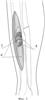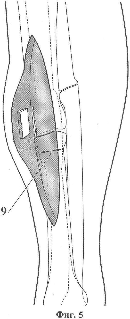 Через образовавшееся окно (8) узким желобоватым долотом производят эндостальную декортикацию обоих отломков на протяжении зоны их склероза со вскрытием костномозговых каналов (3) (фиг.4). В результате в области концов ложного сустава образуется интрамедуллярная костная полость, соединяющаяся с костномозговыми каналами отломков (9) (фиг.5). После завершения этого этапа появляется умеренная упругая подвижность отломков, позволяющая устранять их поперечное смещение в пределах кортикального слоя кости и угловую деформацию сегмента конечности.