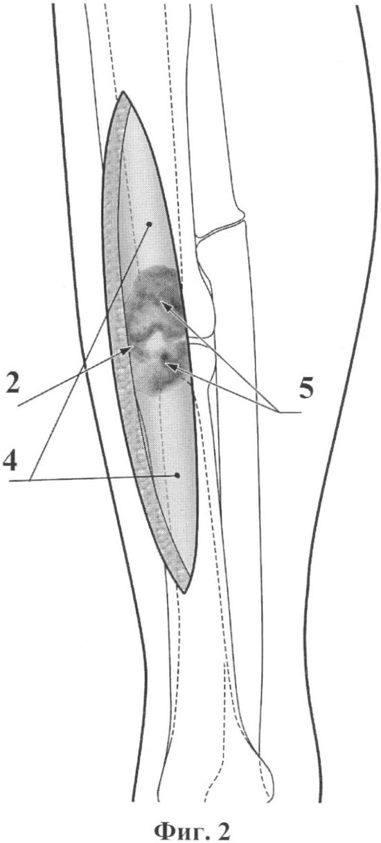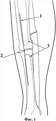 Под общим обезболиванием в асептических условиях линейным разрезом (1) осуществляют стандартный при накостном остеосинтезе для соответствующего сегмента трубчатой кости хирургический доступ к ее ложному суставу (2) с облитерированным костномозговым каналом (3) (фиг.1).