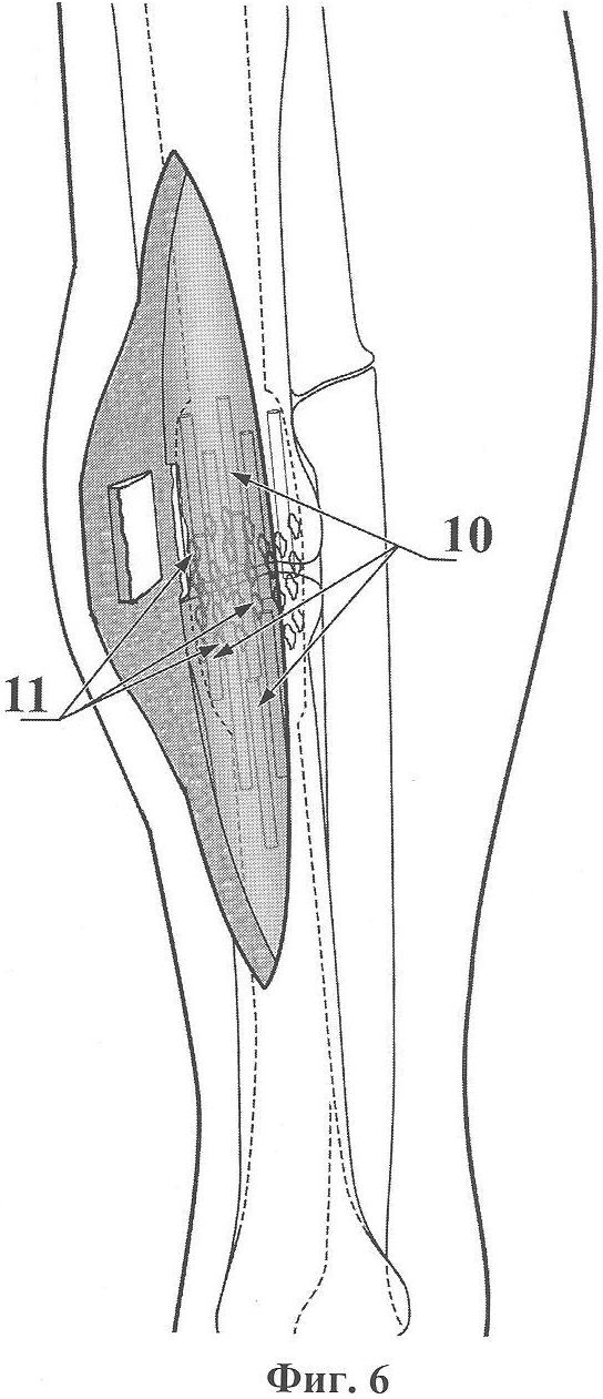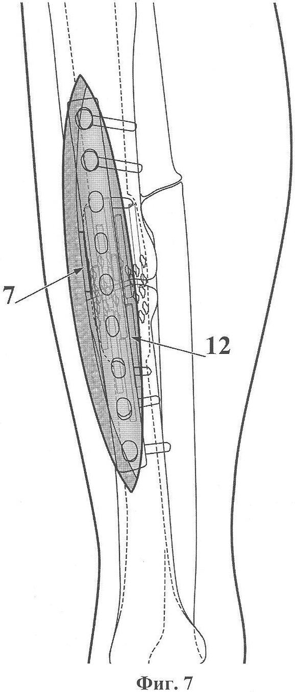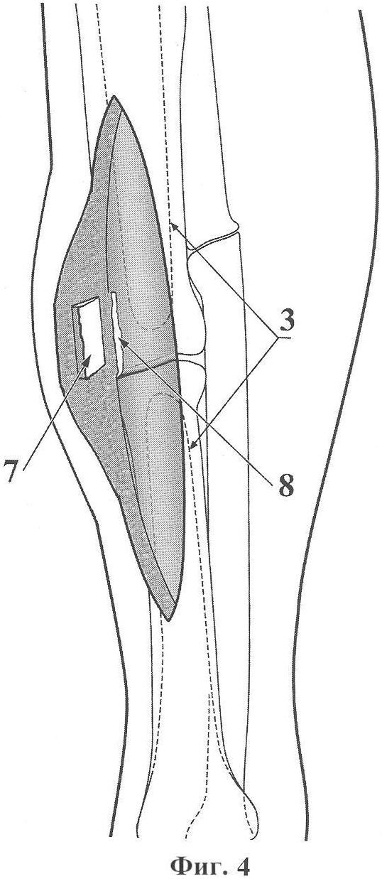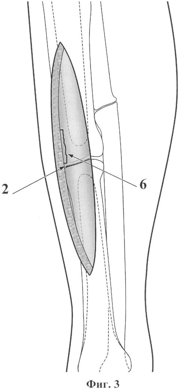 Остеотомом в пределах узкой области подготовленного под пластину ложа резецируют избыточную периостальную костную мозоль (5) (фиг.2) для выравнивания плоскости кости в этой зоне. Инъекционной иглой определяют щель ложного сустава (2) и, начиная от нее, по краю ложа для пластины намечают линию кортикотомии (6) одного из отломков (как правило, более длинного) (фиг.3).