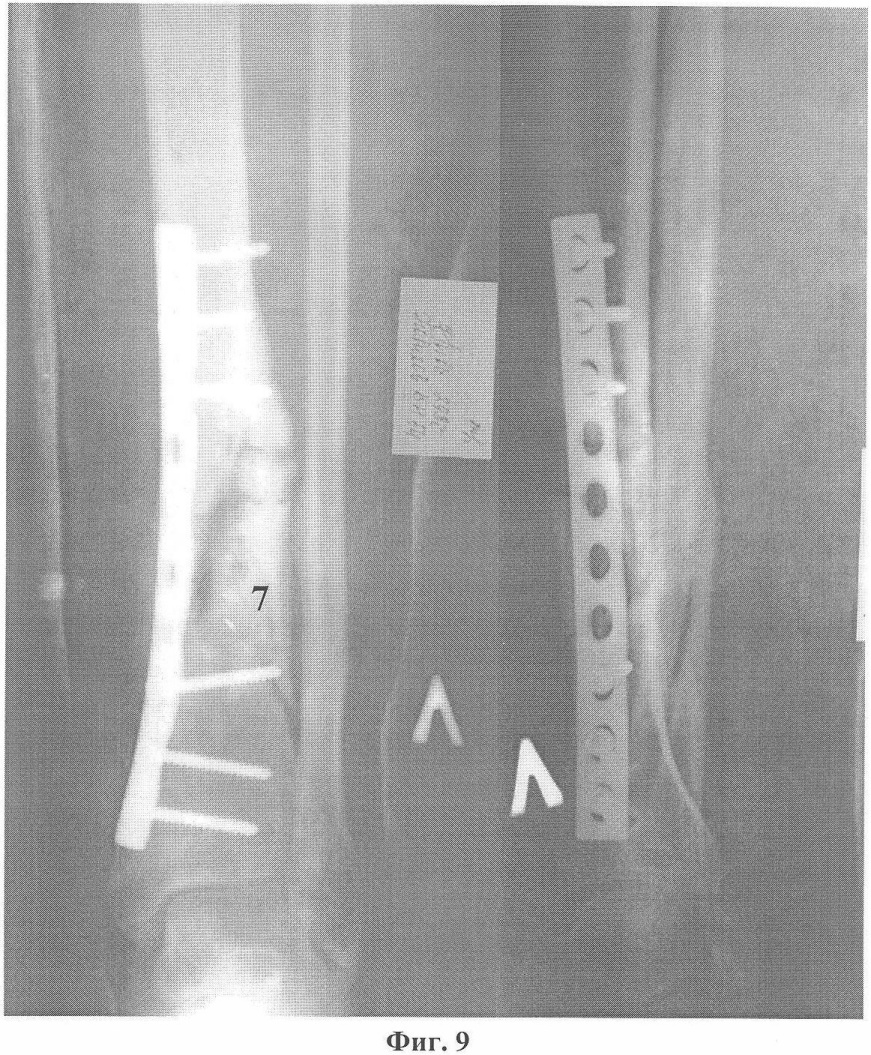 Фиг.9. Контрольная рентгенография после краевой кортикотомии, эндостальной декортикации, пластики интрамедуллярной полости коллостом и костной стружкой, накостного остеосинтеза пластиной со стимуляцией остеогенеза химотрипсином.