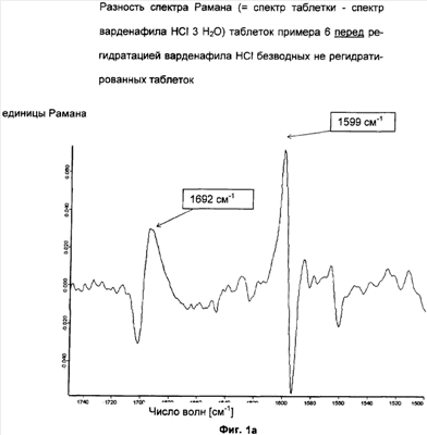 Предложенные согласно изобретению или полученные предложенным согласно изобретению способом таблетки могут однозначно определяться с помощью кристаллической структуры через спектр Рамана (FT-спектр-Рамана тригидрата гидрохлорида варденафила показывает пик значимости при 1701 см-1. Безводные полиморфные и псевдополиморфные формы и их смеси напротив имеют полосы при 1692 см-1), ИК – спектр, спектр в ближней ИК-области, спектр в дальней ИК-области, 13С твердого тела ЯМР – спектр и рентгендифрактограмма (см. Фиг.2, 4-8 и Таблицы 3-8).