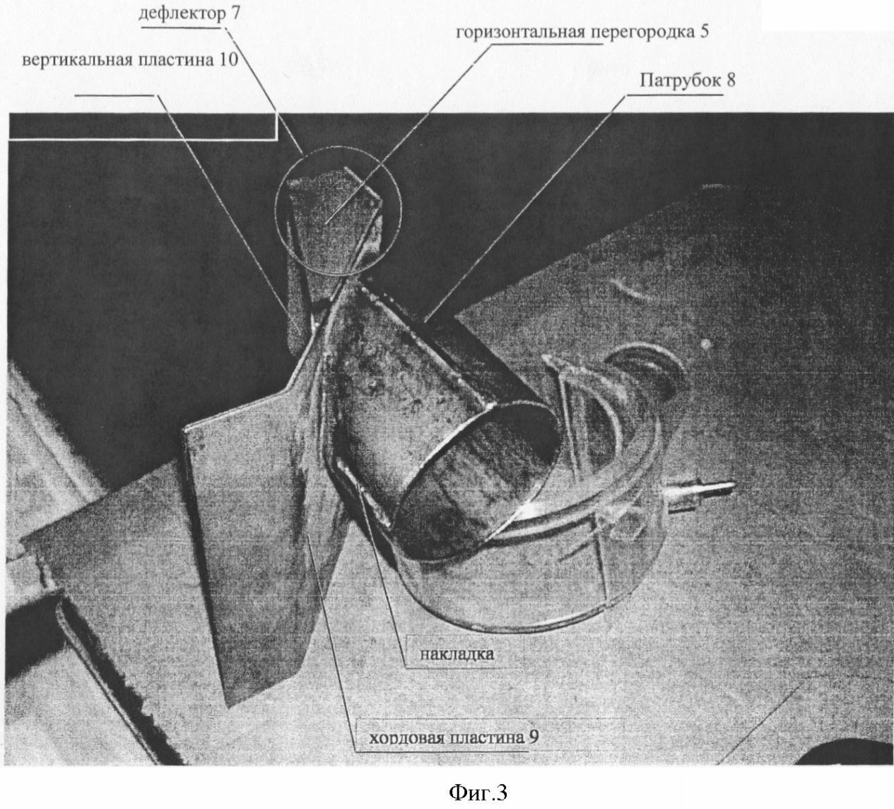 На фотографии изображен патрубок 8 с дефлектором 7 и хордовой пластиной 9, который вставляется в корпус сепаратора в его входной патрубок 2 (фиг.1) и центрируется накладками под горизонтальную перегородку 5 (фиг.1).