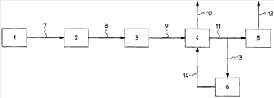 В рассматриваемой схеме часть содержащего высококонцентрированный диоксид углерода газа из трубопровода 11 по трубопроводу 13 нагревают в блоке 6 и после этого по трубопроводу 14 возвращают обратно в блок 4, в котором его используют для регенерации молекулярного сита типа АКТ.