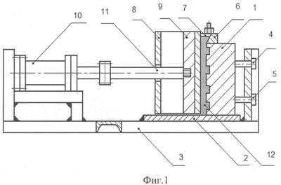 Вкладыш подшипника 1 (фиг.1) установлен на неподвижную платформу 2, жестко соединенную со станиной 3. Станина представляет собой сварную конструкцию в виде рамы из швеллера. Вкладыш фиксируется относительно станины посредством регулируемых упоров 4, 5. На торцевую поверхность вкладыша установлен ограничитель 6 с камерой 7. Поз. 8 обозначен деформирующий инструмент. Деформирующий инструмент может быть выполнен полым, в виде трубы, с элементами жесткости 9. Деформирующий инструмент жестко соединен с гидроприводом 10 посредством толкателя 11. Для нагрева вкладыша предусмотрены нагреватели (на фиг.1 не показаны). Контроль за нагревателями осуществляется посредством термопары (на фиг.1 не показана). Полученный антифрикционный слой на фиг.1 обозначен поз.12.