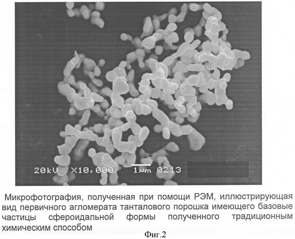 Базовое зерно порошка, получаемого традиционными способами химического восстановления тантала из его соединений, имеет сфероидальную форму (см. фиг.2). Базовые частицы порошка группируются в агломераты различного размера и формы. Измеренный по методу Фишера (FSSS) средний размер зерна порошков, полученных химическими способами, колеблется в интервале от 0,3 до 7 мкм.