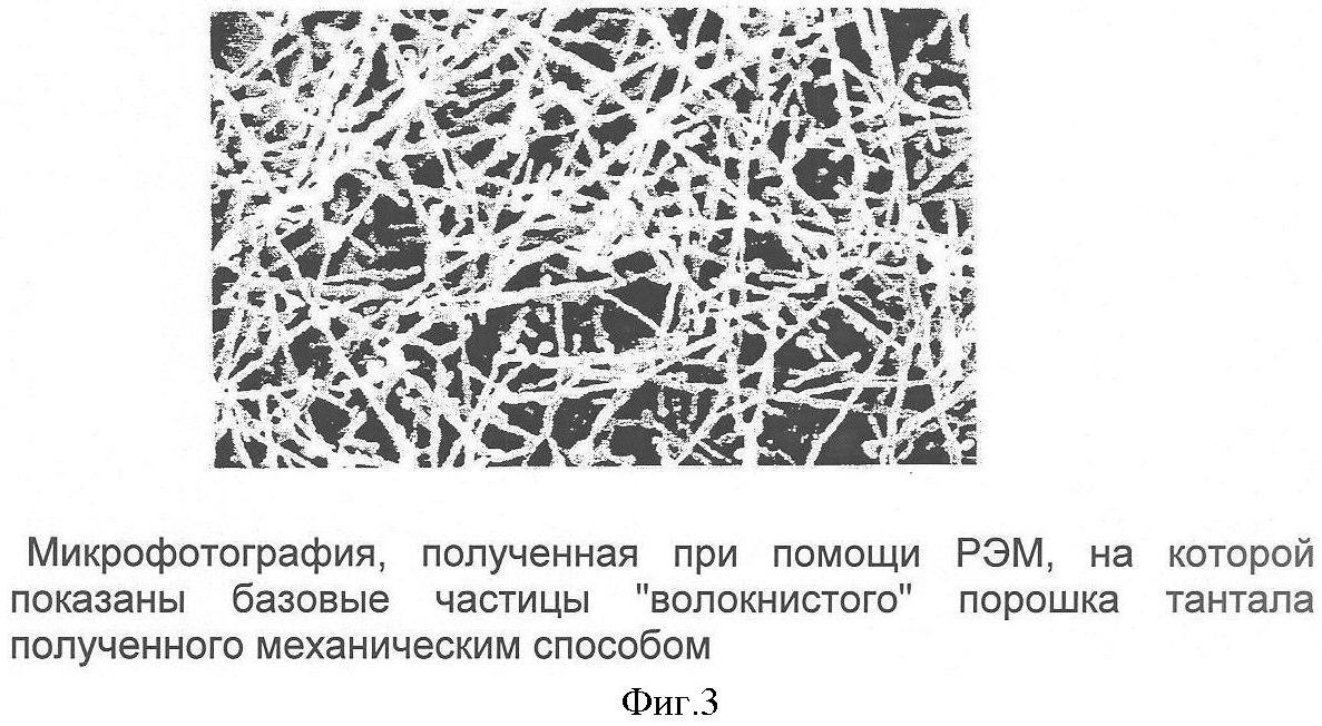Волокнистый порошок тантала имеет базовые металлические частицы волокнистой формы диаметром от 0,04 до 0,6 мкм, длиной от 0,3 до 6 мкм и имеет отношение диаметра к длине от 1/3 до 1/50. Волокнистый порошок тантала имеет средний размер зерна по Фишеру (FSSS) менее 0,4 мкм и удельную поверхность (BET) не менее 2,0 м2/г.