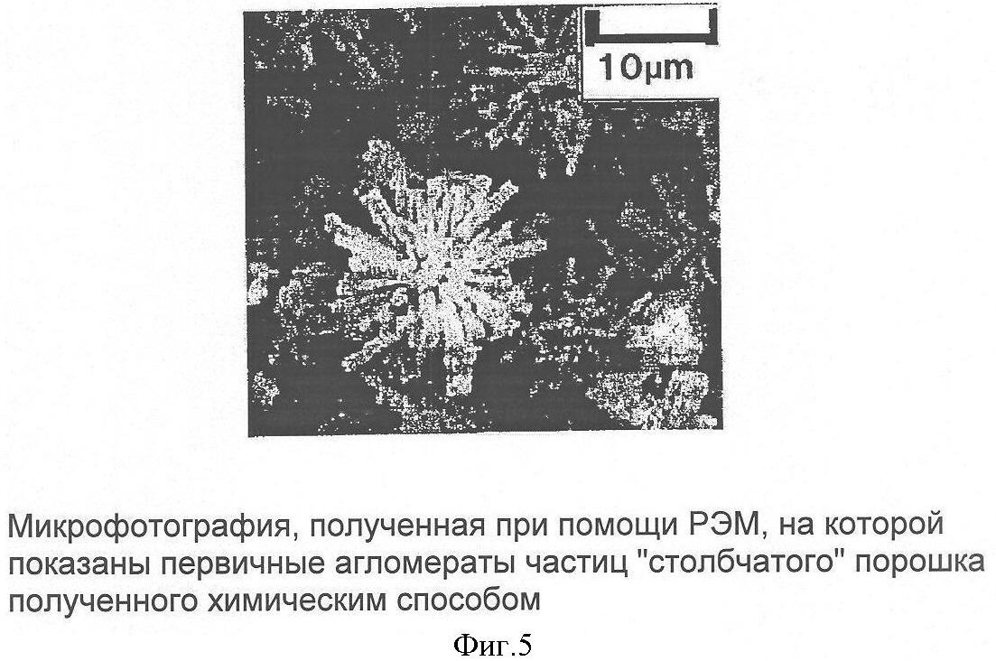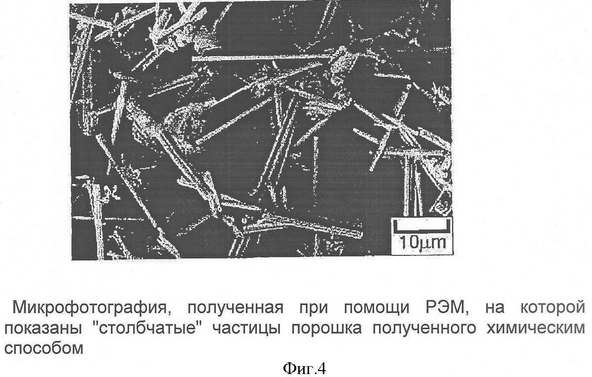“Столбчатые” частицы порошка, получаемого согласно данному изобретению, в сечении имеют форму четырехгранника. Длина стороны четырехгранника находится в интервале от 0,1 до 2 мкм. Длина “столбчатых” частиц находится в интервале от 2 до 20 мкм. Отношение длинны стороны четырехгранника к длине “столбчатой” частицы – от 1/2 до 1/100, в среднем от 1/5 до 1/50. Базовые частицы порошка могут быть соединены в агломераты ежеподобной формы (см. фиг.5). Данный способ принимаем за прототип.