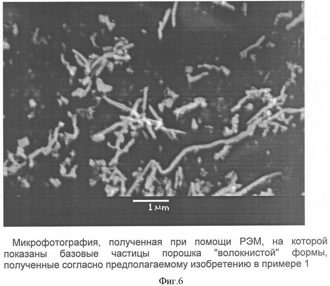 Фиг.6. Микрофотография, полученная при помощи РЭМ, на которой показаны базовые частицы порошка “волокнистой” формы, полученные согласно предлагаемому изобретению в примере 1;