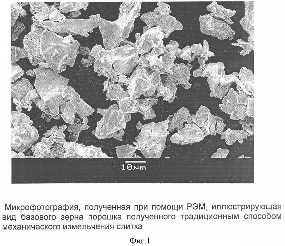 Базовое зерно порошка, получаемого традиционными способами механического измельчения слитка, имеет осколочную форму (см. фиг.1). Крупность порошка и его гранулометрический состав регламентируются по классам.