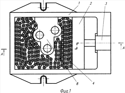 Устройство состоит из открытого корпуса 1 с подвижной нажимной стенкой 2, соединенной с приводом 3, например пневмоцилиндром (фиг.1, 2). В корпусе расположена шарнирная цепь 4, например втулочно-роликовая. Возможно выполнение цепи из колец 5 с прорезями 6, в которых установлены оси 7 с коническими или шаровыми головками на концах (фиг.3, 4). Такое исполнение позволяет кольцам поворачиваться в плоскости относительно друг друга.