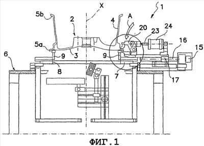 Устройство 1 содержит станину с опорной конструкцией 6, на которой установлена пластина 7, имеющая центральное сквозное отверстие 8. От пластины 7 отходят несколько опорных элементов 9, образующих опорные поверхности для колеса 2 и более подробно описанных ниже. Опорные элементы 9 отстоят по окружности на равных углах и выполнены с возможностью перемещения регулируемым образом в направлениях, радиальных относительно геометрической центральной оси устройства, как указано обозначением Х на чертежах. Таким образом, опорные точки для колеса 2 на опорах выполнены регулируемыми для ограниченного радиального хода. Регулируемость опор обеспечивает возможность размещения полуфабрикатных деталей разных диаметров в устройстве в заданном диапазоне значений. В частности, каждый опорный элемент 9 содержит первую часть 9а, направляемую на пластине 7 и выполненную с возможностью прикрепления к ней, например, винтами, и вторую часть 9b, отходящую под прямым углом от первой части 9а и имеющую на свободном конце головку 10 для опорного контакта с колесом 2, в частности, для обеспечения опорной поверхности для передней части 3 колеса на круговом участке вблизи края 5а.