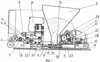 Рабочая полость образована основанием 3, бортами 25 (фиг.2). В верхней части рабочей полости над пустотообразователем 17 установлена формующая плита 18 с возможностью возвратно-поступательного движения от привода 19. Этот привод передает возвратно-поступательное движение, например, с помощью кинематически связанного с ним вала 20, установленного на оси с эксцентриситетом относительно собственной оси вала и образующего с шатуном 21 кривошипно-шатунный механизм. Кроме того, устройство может содержать заглаживающую плиту 22, также установленную с возможностью возвратно-поступательного движения от привода 23. Рама 2 имеет катковые опоры 24 для перемещения экструдера во время работы вдоль стенда.
