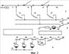 Схема кодирования станционных рельсовых цепей приведена на фиг.2. Элементы схемы соединены следующим образом. К полюсу 16 источника напряжения переменного напряжения подсоединены общие контакты группового кодово-включающего реле 14 и 15, к фронтовому контакту последнего из которых подсоединены фронтовые контакты индивидуальных кодово-включающих реле 11 и 13, к фронтовому контакту 14 – фронтовой контакт индивидуального кодово-включающего реле 12, общие контакты индивидуальных кодово-включающих реле 11, 12 и 13 образуют цепь кодирования участков 7, 8 и 9 соответственно. К тыловому контакту 14 подсоединен первый вывод обмотки реле 19, второй вывод которой через резистор 18 соединен с полюсом 17. К полюсу 20 через последовательно соединенные фронтовые контакты 31 и 30 подсоединены общий контакт 28 и первый полюс резистора 29, второй полюс которого соединен с тыловым контактом 28 и общим 27, тыловой контакт которого соединен с первым выводом обмотки реле 24, а фронтовой – с общим контактом 26, тыловой контакт которого соединен с первым выводом обмотки реле 23, а фронтовой – с общим контактом 25, тыловой контакт которого соединен с первым выводом обмотки реле 22, вторые выводы обмоток реле 22, 23 и 24 соединены с полюсом 21 (схемы узлов 1 и 2 полностью совпадают с прототипом, в пояснениях не нуждаются и в формуле изобретения не заявляются).