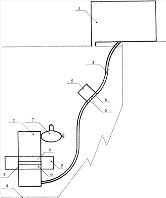 Размещение монтажного корпуса 1 на суше позволяет создать условия для разведки подводных месторождений полезных ископаемых, а также для последующего освоения их при любых метеорологических процессах над водой круглогодично, так как продвижение головной части комплекса и соединенной с ней транспортной системы 3 вместе с управляющими и силовыми кабелями осуществляют в придонных слоях воды. Головную часть 2 комплекса для разработки подводных месторождений полезных ископаемых строят, испытывают и спускают под воду в специальном бассейне, размещенном внутри монтажного корпуса 1. Там же к головной части 2 присоединяют конструкции транспортной системы 3, а также кожухи с силовыми и управляющими кабелями. Для обеспечения плавучести головной части 2 комплекса к ней присоединяют расчетное количество понтонных блоков 5. По мере наращивания длины транспортной системы 3 в бассейн спускают очередные понтонные блоки и надежно соединяют их с кожухами трубопроводов с использованием стяжек 6. Управление плавучестью головной части комплекса 2 и соединенных с ней конструкций транспортной системы 3, а также кожухов с силовыми и управляющими кабелями обеспечивают путем применения метода дозированной перекачки жидкости из безкингстонных цистерн понтонных блоков 5 в кингстонные цистерны этих блоков и обратно. Этот метод раскрыт в описании изобретения к патенту RU №2246421, которое опубликовано 20 февраля 2005 года в Бюллетене Федеральной службы по интеллектуальной собственности, патентам и товарным знакам Российской Федерации №5 [3]. Конструкция понтонных блоков 5, показанная в описании изобретения к патенту RU №2246421, обеспечивает размещение в батискафах акванавтов либо дистанционное управление оборудованием каждого понтонного блока. При применении указанных понтонных блоков для управления плавучестью головной части 2 комплекса для разработки подводных месторождений полезных ископаемых, а также всей транспортной системы 3 дистанционное управление оборудованием каждого понтонного блока из монтажного корпуса 1 и из состыкованных с головной частью комплекса подводных лодок 7 позволяет в любой момент времени работы комплекса послать в каждый понтонный блок 5 команду в виде электрических импульсов на перекачку жидкости из одних цистерн в другие с целью изменения плавучести этого понтонного блока, что приведет к изменению его отметки относительно поверхности воды. Многократным дозированием количества перекачиваемой жидкости внутри понтонных блоков достигают поддержания экономически выгодного профиля всей транспортной системы 3, что позволит избежать резких прогибов кожухов и трубопроводов при пересечении ими понижений и возвышений дна. Применение дистанционной системы управления плавучестью каждого понтонного блока 5 обеспечивает возможность подъема головной части 2 и всей транспортной системы 3 комплекса для разработки подводного месторождения полезных ископаемых с последующим перемещением его к новому месту посадки головной части 2 на дно. Доставку труб и других изделий и материалов, необходимых для бурения и обустройства очередных скважин осуществляют в капсулах, которые перемещают внутри труб транспортной системы 3 за счет создания разности давлений воздуха с разных сторон уплотняющих манжет на поверхности капсул. П