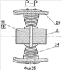 Также при специальных требованиях к конструкции винта его торсионы 2 могут быть соединены с валом 1 на карданном подвесе или на общем горизонтальном шарнире для двух лопастей. На фиг 19…21 представлен винт, у которого каждая пара из четырех торсионов 2 выполнена как единое целое, а все торсионы соединены с валом 1 через пальцы 21 и 22 кардана, карданное кольцо 23, корпус 24 втулки. На фиг.22…26 показана конструкция двухлопастного винта на общем горизонтальном шарнире, где два торсиона 2, выполненные как единое целое, непосредственно соединены с валом 1 винта через палец 25 шарнира. Типы всех вышеуказанных шарниров могут быть разными (эластомерные, сухого трения, механические или другие) и выбираются под конкретные технические требования.