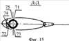 Управление самолетом “Максинио” в аэростатических режимах полета (этапы I и V) состоит в обеспечении устойчивого горизонтального положения в режиме зависания и вертикального перемещения его. В отличие от режимов аэростатического полета в переходных этапах II и IV одновременно с сохранением аэростатической подъемной силы от обдува несущих полуплоскостей самолета отобранной от воздушного потока двигателя частью его на переходных режимах с ростом горизонтальной скорости растет аэродинамическая подъемная сила, однако до достижения скоростью величины, на которой начинают действовать аэродинамические рули, устойчивость полета и управление самолетом осуществляется аэродинамическими рулями и системой управления. Управление по курсу, описанное в примере 8, посредством струйного руля 71 (фиг.15) на малых скоростях полета может использоваться одновременно с аэродинамическим рулем направления известной конструкции (показан условно, не обозначен).
