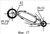 Для этого включают реверс тяги и перекладывают створки 75 в положение, обеспечивающее разделение реактивной тяги двигателя(ей) Fp на две половинки, из которых одна аэростатическая прямая – Fап, а вторая – суммарная аэростатическая обратная Fcao=0,25Fp+0,25Fp создается струями, вытекающими из решеток 7 реверса (фиг.16 и 1). Одновременно включают подачу воздуха из ресивера 5 канала 4 воздухозаборника или 6 компрессора ТРД (или не показанного ресивера второго контура ТРДД) к предкромочным распределителям 20, 21 полуплоскостей 12, 13 крыла и 18, 19 полуплоскостей 11, 10 горизонтального оперения. Подведенный к ним воздух по щелям ряда 32 корпуса и щелям одного из рядов 33, 34, 35 распределителя выпускается над верхней и под нижней поверхностями (фиг.17) каждой полуплоскости в порядке их совмещения. Одновременное с подачей воздуха в распределители по магистралям 29 с открытым краном разряжение ресивера 9 передается в воздухозаборники 25, 24 крыла и 22, 23 горизонтального оперения и через щели ряда воздухозаборника, совмещенного с рядом щелей корпуса, создается разряжение у задней кромки полуплоскостей крыла и оперения, притягивая и ускоряя засасывание выпущенного перед их передними кромками воздуха после перемещения его над и под несущими поверхностями. Обтекание, таким образом, воздушного потока в соответствии с законом обращения движения создает аэростатическую подъемную силу. Это засасывание и ускорение обтекания обеспечивается подводом и сгоранием топлива в камере сгорания и многократным увеличением скорости газовоздушного потока после камеры сгорания. Как и в аэродинамическом принципе создания подъемной силы за счет разности обтекания верхней и нижней плоскостей, разность обтекания в аэротстатическом принципе существенно больше и соответственно больше подъемная сила.
