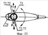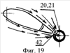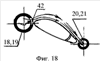 Аэростатический принцип полета обеспечивает расширение упомянутых эксплуатационных возможностей, так как для этого достаточно выставить корпуса предкромочных распределителей 20, 21 и 18, 19 таким образом, чтобы воздух из их щелей 72 выдувался преимущественно над верхней несущей поверхностью и всасывался закромочными воздухозаборниками 24, 25 и 22, 23, как это показано на фиг.18. Разность скоростей пограничных слоев воздуха у несущих этих плоскостей в данном варианте уже будет определяться по формуле – Vв-0, так как скорость обтекания нижней несущей поверхности равна нулю.