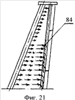 Преимущество создания аэростатической подъемной силы обтеканием одной верхней несущей поверхности, фиг.19, не исчерпывает возможностей улучшения эксплуатационных свойств заявленного самолета. Расширение эксплуатационных свойств достигается и в комбинированных режимах создания аэростатической подъемной силы, один из которых изображен на фиг.21. Величиной аэростатической подъемной силы можно управлять, регулируя площадь обдува плоскости одного или сочетанием обдува одинаковых участков двух полуплоскостей, например крыла, или сочетанием двух разных его участков. На фиг.21 показан вариант с выпуском воздушного потока из всех щелей предкромочного распределителя 20, 21 и отсосом выпущенного воздуха корневой половиной ряда щелей закромочного воздухозаборника 84. Вследствие малой длины хорды концевой половины полуплоскости обтекание этой половины можно обеспечить в аэростатическом режиме только выдувом воздуха из концевой половины предкромочного распределителя.