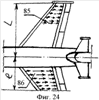 На фиг.24 показан один вариант рассогласования подъемной аэростатической силы на крыле. Если одна из полуплоскостей будет обдуваться воздухом из ресивера двигателя(ей) из щелей центрального ряда 33 предкромочного распределителя (фиг.3), то аэростатическая подъемная сила на ней будет максимально возможной на каждом режиме работы двигателя. Если же обдуваться будет часть полуплоскости или рассогласование будет между выдувом воздуха из распределителя и эжектированием его в воздухозаборник, то соответственно будет изменяться и подъемная сила на ней. Так, аэростатическая подъемная сила полуплоскостей, фиг.24, с обдувом концевой половины 85 одной и корневой половины 86 другой полуплоскости и их эжектированием определяется площадями этих частей, а момент ими создаваемый еще и расстоянием центра их приложнения на левой и правой полуплоскости соответственно от продольной оси самолета Sл SпL. При этом для восстановления горизонтального положения самолета на полуплоскости, поднятой над горизонтальной плоскостью, следует создавать меньшую подъемную силу, а на опущенной или увеличить, или оставить прежней, действующей до появления крена. А после восстановления горизонтального положения самолета (крыла) обдув поднятой полуплоскости меняют на симметрично-согласованный с другой полуплоскостью. Темп восстановления накренившегося самолета выбирают, включая обдув одной половинки или всей полуплоскости, в следующем порядке: при большом угле крена обдув включают одновременно с эжектированием, при среднем – только эжектирование, а при малом – можно восстановление обеспечить только включением обдува. Менее эффективно использование полуплоскостей горизонтального оперения для устранения крена, но в сочетании с использованием регулирования подъемной силы крыла вполне возможно.