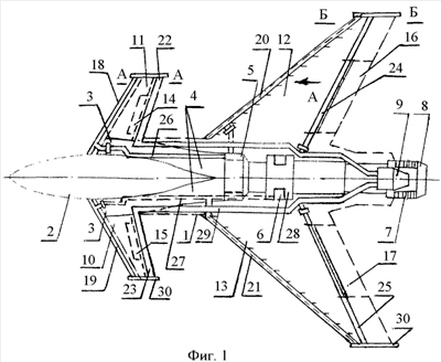 12. Самолет по п.10, отличающийся тем, что он выполнен с двигателями, расположенными в мотогондолах, интегрированых в лонжероны крыла, установленными на пилонах нижней или верхней стороны его, расположенных на верхней стороне фюзеляжа пилонах, на боковых сторонах хвостовой части его, в том числе в комбинации с интегрированным в хвостовую часть фюзеляжа двигателем, воздухозаборник которого расположен на верхней или нижней стороне фюзеляжа.
