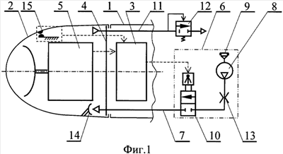 14. Беспилотный летательный аппарат по п.12 или 13, отличающийся тем, что линия сообщения компрессора с полостью обтекателя снабжена перекрывным клапаном.
