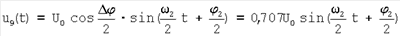 При бинарной фазовой манипуляции, т.е. при k(t)={0, },  =90°, ФМн-сигнал u7(t) не содержит в своем спектре колебаний несущей частоты 2, так как cos90°=0. На выходе делителя 33 фазы на два в спектре полученного колебания появляется составляющая несущей частоты 2/2, так как и колебание несущей частоты
