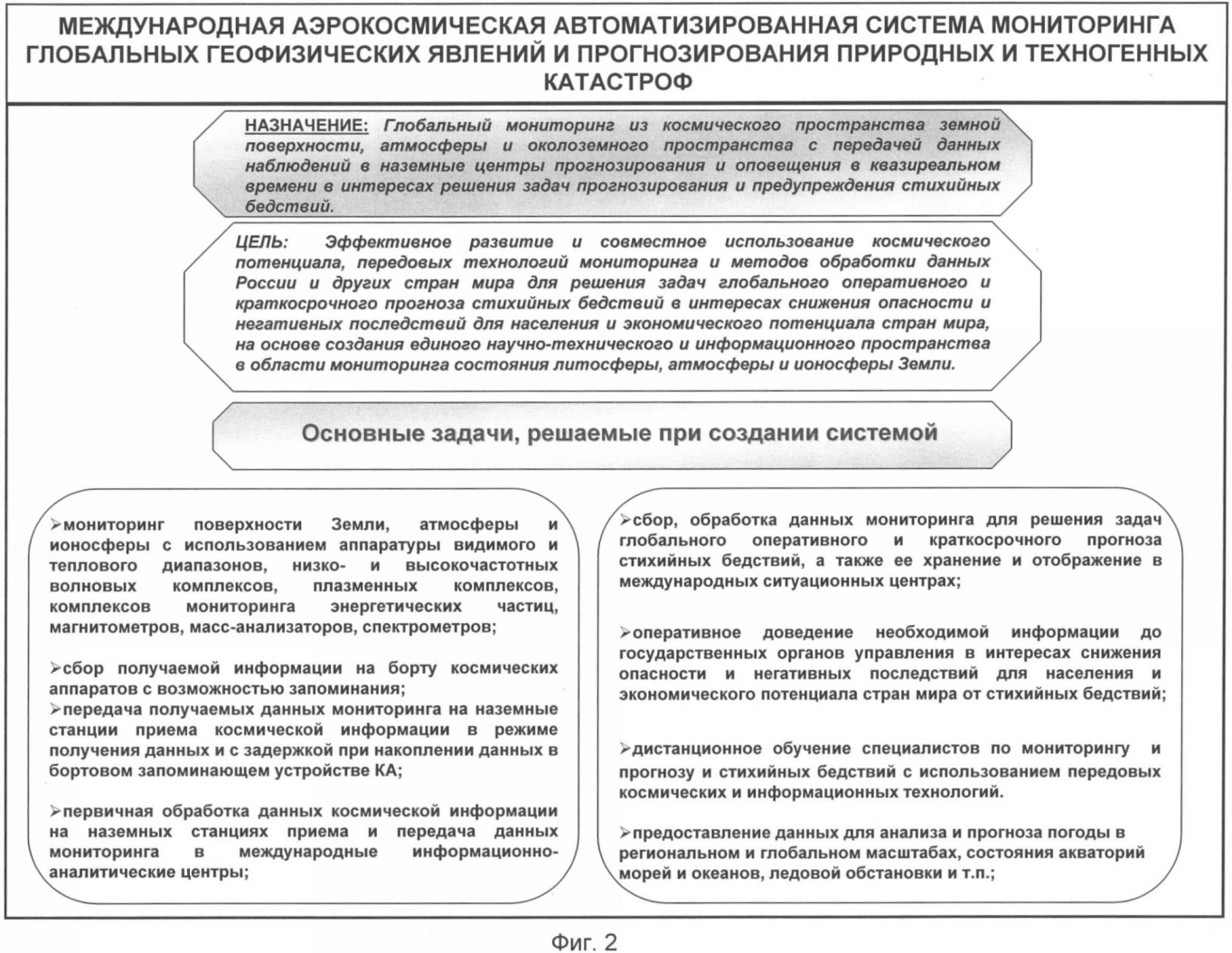 Практически неизвестны международные аэрокосмические автоматизированные системы мониторинга глобальных геофизических явлений и прогнозирования природных и техногенных катастроф, создаваемые для решения следующих основных задач: