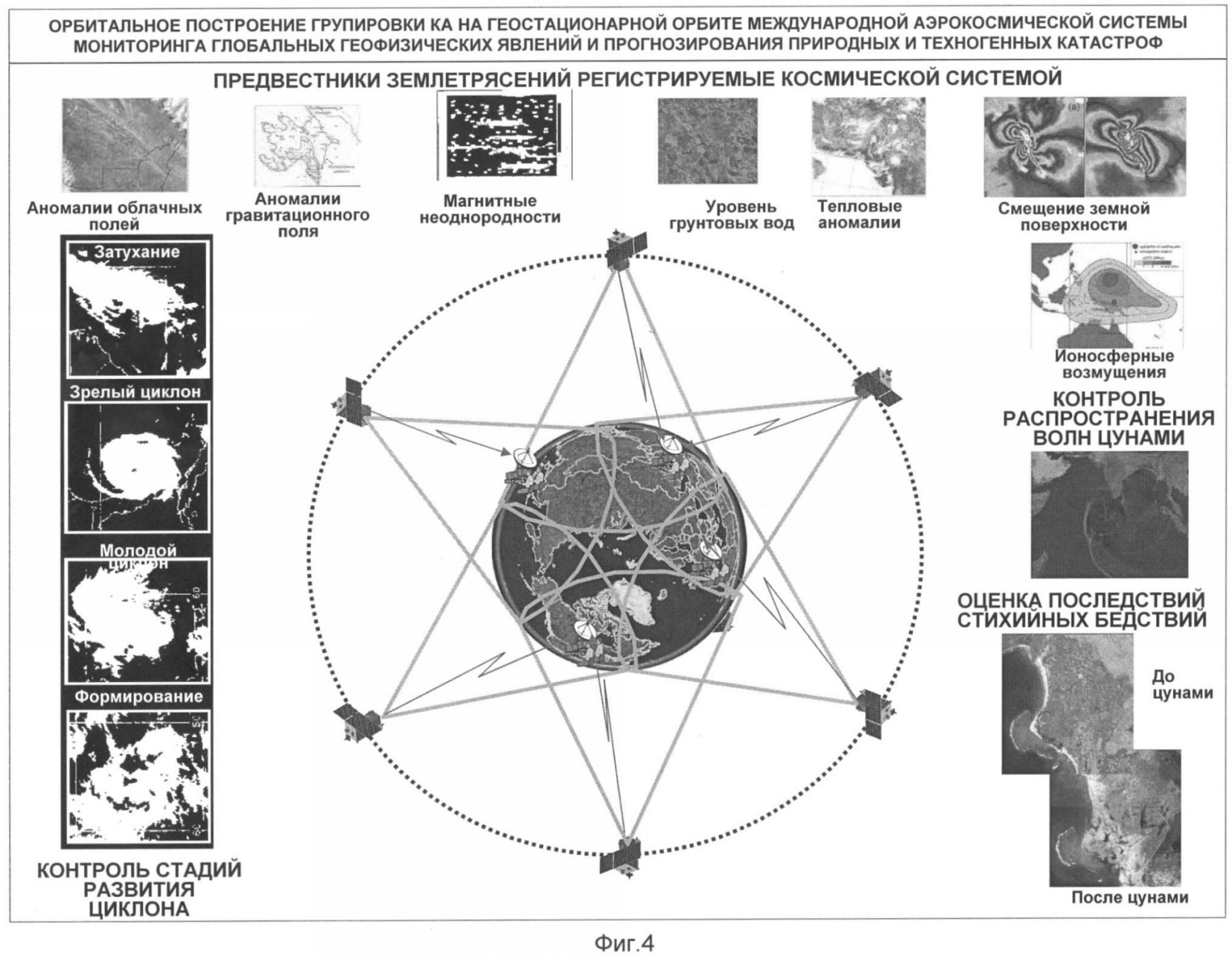 Изобретение относится к технике мониторинга глобальных геофизических явлений и прогноза возникновения и развития стихийных природных и техногенных бедствий на Земле. Система содержит космический сегмент и наземный сегменты. Космический сегмент состоит из трех орбитальных группировок. В орбитальной группировке малых космических аппаратов (МКА), расположенных на геостационарной орбите, МКА, объединенные в две орбитальные группировки по три спутника на вершинах двух треугольных плоскостей, образуют созвездие из шести вершин. Для орбитальной группировке в составе 3-4-х МКА на солнечно-синхронных орбитах высотой 600-700 км предусмотрено равномерное расположение плоскостей орбит по долготе восходящего узла. В орбитальной группировке из 50-ти микроспутников (МККА) последние расположены в основном на солнечно-синхронных орбитах и частично на геостационарных орбитах. На МКА и МККА установлена высокочувствительная аппаратура с комплексом приборов измерения предвестников землетрясений и датчиков оперативного контроля и прогнозирования природных и техногенных катастроф. Система, обеспечивающая автоматизированный аэрокосмический мониторинг глобальных геофизических природных и техногенных катастроф, позволяет получить оперативный краткосрочный прогноз – предупреждение за дни и часы. 9 з.п. ф-лы, 9 ил.