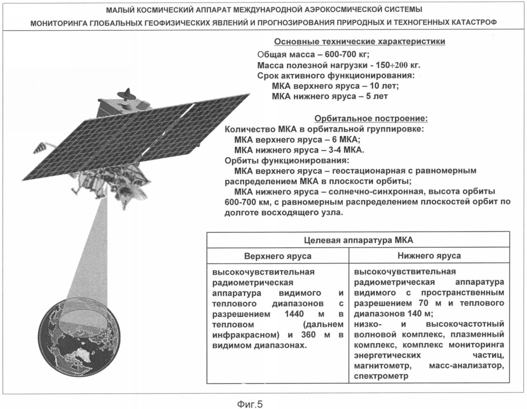 6. Система по п.2, отличающаяся тем, что в состав бортовой аппаратуры космического сегмента входят приборы, для размещения которых пригодны МКА с массой полезной нагрузки 150-200 кг, а также МККА с массой полезной нагрузки до 70 кг, и которые составляют параметрический ряд измерителей предвестников землетрясений, в том числе ионозонды, магнитометры, приемник низко- и высокочастотных радиоизлучений, детекторы элементарных частиц, ИК-радиометры для фиксации аномального повышения температуры, высокоточные радиолокационные средства и лазерные дальномерные системы, при этом на одном борту МКА имеет место сочетание аппаратуры детектирования предвестников землетрясения и мониторинга чрезвычайных ситуаций.