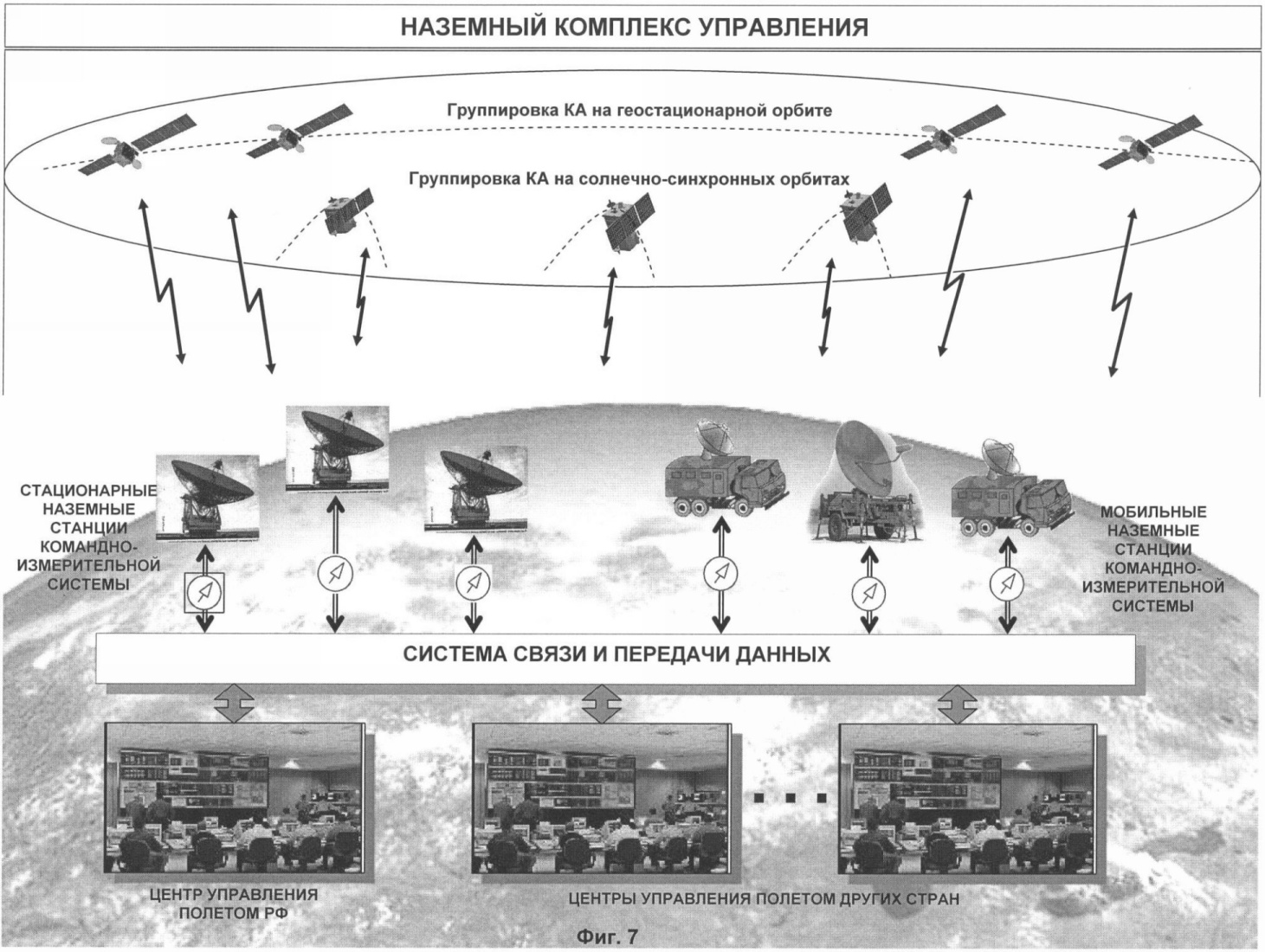 – наземные станции приема космической информации с геостационарных МКА 32, 34, низкоорбитальных МКА и МККА 33,34 (фиг.1, 8);