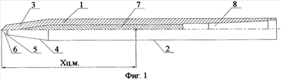 Также угол наклона образующей другого усеченного конуса составляет 7-12°, диаметр цилиндра составляет 0,2-0,5 диаметра цилиндрической хвостовой части корпуса, длина цилиндра составляет 0,1-2,0 его диаметра, а угол раствора конуса или первого усеченного конуса составляет 90-120°.
