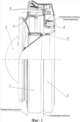 АСП (фиг.1) содержит основной корпус 1, устанавливаемый на космический модуль по привалочной плоскости, и переходной стыковочный узел 2, стыкуемый с основным корпусом по стыковочной плоскости системой механических замков 3, размещаемых по ее периферии и входящих в механизм герметизации стыка 4. Механические замки 5 размещены по периферии второй стыковочной плоскости (межаппаратной) переходного стыковочного узла 2 и входят в механизм герметизации стыка 6. На основной корпус 1 устанавливается крышка переходного люка 7, которая имеет механическую связь с приемным конусом 8. При этом основной корпус 1 и переходной стыковочный узел 2 содержат электроразъемы 9, а также гидроразъемы 10, электромеханические устройства автоматики 11 (фиг.2), размещаемые по периферии стыковочных плоскостей с образованием узлов взаимодействия между ответными частями соответствующих элементов, размещаемых на основном корпусе 1 и переходном стыковочном узле 2, а также с ответными элементами, размещаемыми на агрегате стыковочном активном.
