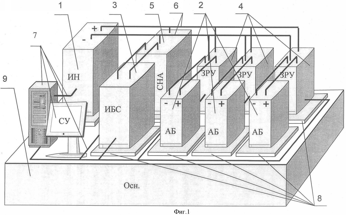 На фиг.1 показано устройство прототипа. Известный стенд состоит из имитатора нагрузки 1, аккумуляторных батарей 2, имитатора батареи солнечной 3, комплекса автоматики и стабилизации напряжения, содержащего зарядно-разрядные устройства 4 и стабилизатор напряжения и автоматику 5, из “плюсовых” и “минусовых” шин 6, соединяющих элементы КАС с имитатором нагрузки 1, АБ 2 и ИБС 3 с образованием соединенных параллельно с ИН 1 подсистем “АБ+ЗРУ” и “ИБС+СНА”, из системы управления 7 с вычислительной машиной и линиями (кабелями) информационной связи между СУ 7, ИН 1 и подсистемами (“АБ+ЗРУ” и “ИБС+СНА”), из вспомогательного оборудования, в том числе средств обеспечения теплового режима 8 элементов стенда (АБ 2, КАС и др.), а также из основания 9, служащего для формирования стенда во взаимосвязанную конструкцию.