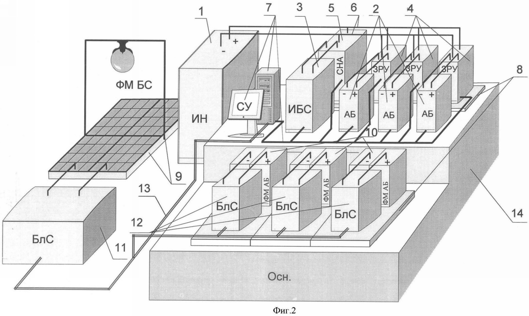 Стенд состоит из имитатора нагрузки 1, аккумуляторных батарей 2, выполненных в виде электронных имитаторов, имитатора батареи солнечной 3, комплекса автоматики и стабилизации напряжения, содержащего зарядно-разрядные устройства 4 и стабилизатор напряжения и автоматику 5, из “плюсовых” и “минусовых” шин 6, соединяющих элементы КАС с имитатором нагрузки 1, АБ 2 и ИБС 3 с образованием соединенных параллельно с ИН 1 подсистем “АБ+ЗРУ” и “ИБС+СНА”, из системы управления 7 с вычислительной машиной и линиями (кабелями) информационной связи с ИН 1 и подсистемами (“АБ+ЗРУ” и “ИБС+СНА”), из вспомогательного оборудования, в том числе средств обеспечения теплового режима (СОТР) 8 элементов стенда, из корректирующих устройств – физической модели батареи солнечной (ФМ БС) 9, включающей малогабаритную батарею фотоэлектрическую и осветитель и физических моделей аккумуляторных батарей (ФМ АБ) 10, из блоков сопряжения (БлС) 11 и 12 физической модели батареи солнечной 9 и физических моделей аккумуляторных батареи 10, соответственно из общей цифровой шины 13, а также из основания (Осн.) 14, служащего для формирования стенда во взаимосвязанную конструкцию.