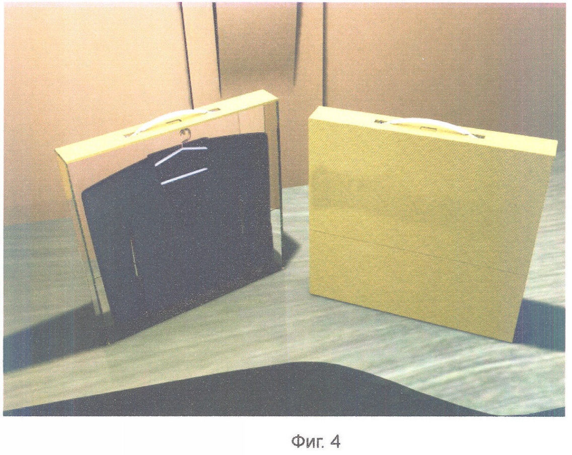Таким образом, предложенная конструкция упаковки проста в изготовлении и сборе, удобна в пользовании, обладает низкой материалоемкостью и высокой надежностью в эксплуатации. Кроме этого, большие партии предложенной упаковки удобны при хранении как в виде выкройки, так и в собранном виде с размещенной в ней одеждой, так как обладают меньшими габаритами за счет отсутствия ручек в первом случае и возможности «утопить» ручки в полость упаковки во втором случае.