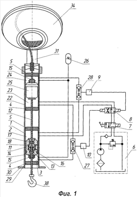 Лебедка с гидравлическим шаговым приводом содержит цилиндр 1 с рабочей 2 и возвратной 3 полостями и узлами 4 и 5 герметизации, насосный агрегат 6, распределители 7 и 8, датчики 9 и 10 контроля положения. В цилиндре 1 установлен поршень 11, имеющий возможность перемещения вдоль гибкого штока 12. Поршень 11 выполнен с расточкой 13, в которой размещена коническая цанга 14, подпружиненная при помощи пружины 15 относительно поршня 11, охватывающая гибкий шток 12 и взаимодействующая со ступенчатым поршнем 16, размещенным в поршне 11. Шток 12 уплотнен относительно поршня 11 поджимным сальником 17 с нажимным элементом 18. Ступенчатый поршень 16 и нажимной элемент 18 образуют в расточке 13 поршня 11 полости 19-21. При этом полости 19 и 21 сообщены посредством зазоров между частями сборного поршня с возвратной полостью 3, а полость 20 – с рабочей полостью 2. Гибкий шток 12 проходит также через второй гидроцилиндр 22, имеющий такие же узлы герметизации 4 и 5, рабочую 23 и возвратную полость 24 и поршень 25, имеющий точно такую же конструкцию, что и поршень 11 и поэтому изображенный на чертеже без разреза – непрозрачным. При этом поршень 25 так расположен в гидроцилиндре 22, что тяговое усилие, развиваемое им, направлено противоположно тяговому усилию, развиваемому поршнем 11. Возвратные полости 3 и 24 соединены между собой и гидропневмоаккумулятором 26 трубопроводами. Сигнал о крайнем левом положении поршня 11 и о крайнем левом положении поршня 25 поступает через логический элемент «И» 27 на датчик положения 10, а сигнал о правом положении поршня 11 и правом положении поршня 25 поступает через логический элемент «И» 28 на датчик положения 9. Гидроцилиндры 1 и 22 помещены в корпус цилиндрической формы 29 с фланцем 30 в нижней части для крепления лебедки. В верхней части корпуса размещены траверса 31 и мундштук 32, через который выходит холостая ветвь гибкого штока 33, конец которого помещен в корзину 34 конической формы с осью 35, вращающейся на подшипниках, расположенных в подшипниковых узлах 36 и 37, размещенных на траверсе 31. На рабочей ветви гибкого штока помещен крюк 38.