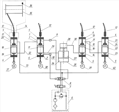 Прицепные устройства 37, 38, 39 и 40 также переместятся на одинаковое расстояние и переместят синхронно перемещаемый объект. По достижении поршнем 11 крайнего верхнего положения сигнал с датчика положения 9 поступит на катушку управления гидрораспределителя 8, который переключится в реверсивный режим.