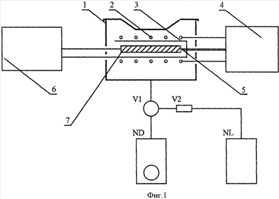 Устройство для реализации способа формирования наноразмерных пористых структур твердокристаллических материалов состоит из вакуумной камеры 1, внутри которой размещены нагревательный элемент 2 и экран 3, выполняющий роль катода. Камера снабжена форвакуумным насосом (NL) и диффузионным насосом (ND) с системой коммутации, содержащей клапаны V1 и V2. Блок 4 контроля и регулирования температур содержит элемент 5 контроля температуры, в качестве которого могут использоваться термопара или пирометрический датчик, а также систему регулирования температуры с преобразователем подаваемого на нагревательный элемент электропитания. Высоковольтный блок 6 служит для создания разности потенциалов между технологическим объектом и экраном.