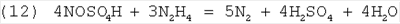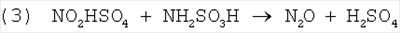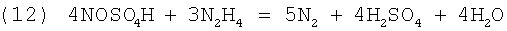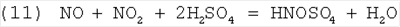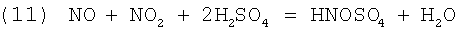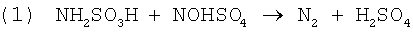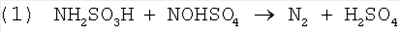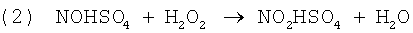 Предлагаемый способ был испытан на установке получения серной кислоты предприятия. Пример 1. На установку производства серной кислоты поступает сероводородсодержащий газ с содержанием 0,3% мас. аммиака. Сероводородсодержащий газ сгорает в котле-утилизаторе с образованием первого технологического газа, в состав которого входит диоксид серы и оксид азота, далее этот технологический газ поступает в конвертор. В конверторе образуется второй технологический газ, в состав которого входит триоксид серы, образованный из диоксида серы, и диоксид азота, образованный из оксида азота. Далее второй технологический газ поступает в конденсатор, где образуется серная кислота. С верха конденсатора выходит выхлопной газ, содержащий 400-1000 мг/м3 NO2. Серная кислота содержит 10-100 ppm N2O2, или 29-291 ppm HNOSO4, что не соответствует требованиям ГОСТ 2184-73 «Кислота серная улучшенная». Пример 2. На установку производства серной кислоты поступает сероводородсодержащий газ с содержанием 0,3% мас. аммиака. Сероводородсодержащий газ промывается водой в смесителе. Количество воды для промывки составляет 5-50% мас. сероводородсодержащего газа. Вода отделяется в сепараторе и поступает на установку Клауса в колонну десорбции. Далее очищенный сероводородсодержащий газ сгорает в котле-утилизаторе с образованием первого технологического газа, в состав которого входит диоксид серы и оксид азота, далее этот технологический газ поступает в конвертор. В конверторе образуется второй технологический газ, в состав которого входит триоксид серы, образованный из диоксида серы, и диоксид азота, образованный из оксида азота. Далее второй технологический газ поступает в конденсатор, где образуется серная кислота. С верха конденсатора выходит выхлопной газ, содержащий 5-10 мг/м3 NO2. Серная кислота содержит 1-5 ppm N2O3, или 2,9-29,1 ppm HNOSO4, что не соответствует требованиям ГОСТ 2184-73 «Кислота серная улучшенная». Пример 3. На установку производства серной кислоты поступает сероводородсодержащий газ с содержанием 0,3% мас. аммиака. Сероводородсодержащий газ сгорает в котле-утилизаторе с образованием первого технологического газа, в состав которого входит диоксид серы и оксид азота, далее этот технологический газ поступает в конвертор. В конверторе образуется второй технологический газ, в состав которого входит триоксид серы и диоксид азота, образованный из диоксида серы и оксида азота. Далее второй технологический газ поступает в конденсатор, где образуется серная кислота. С верха конденсатора выходит выхлопной газ, содержащий 400-1000 мг/м3 NO2. Серная кислота содержит 10-100 ppm N2O3, или 29-291 ppm HNOSO4. Серную кислоту подвергают финишной обработке путем добавки гидразина в количестве 8-80 ppm. Серная кислота, выходящая в парк, содержит 1-2 ppm N2O3, что не соответствует требованиям ГОСТ 2184-73 «Кислота серная улучшенная». Пример 4. На установку производства серной кислоты поступает сероводородсодержащий газ с содержанием 0,3% мас. аммиака. Сероводородсодержащий газ промывается водой в смесителе. Количество воды для промывки составляет 5-50% мас. сероводородсодержащего газа. Вода отделяется в сепараторе и поступает на установку Клауса в колонну десорбции. Очищенный сероводородсодержащий газ сгорает в котле-утилизаторе с образованием первого технологического газа, в состав которого входит диоксид серы и оксид азот